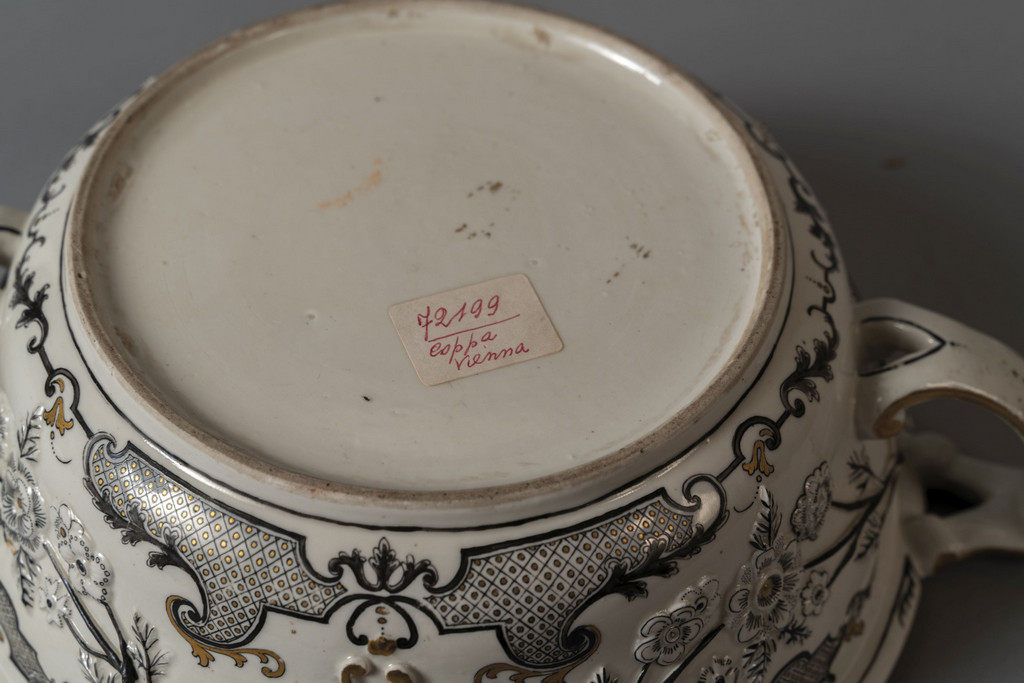 Tazza biansata in porcellana bianca, nera e oro, Vienna circa 1730