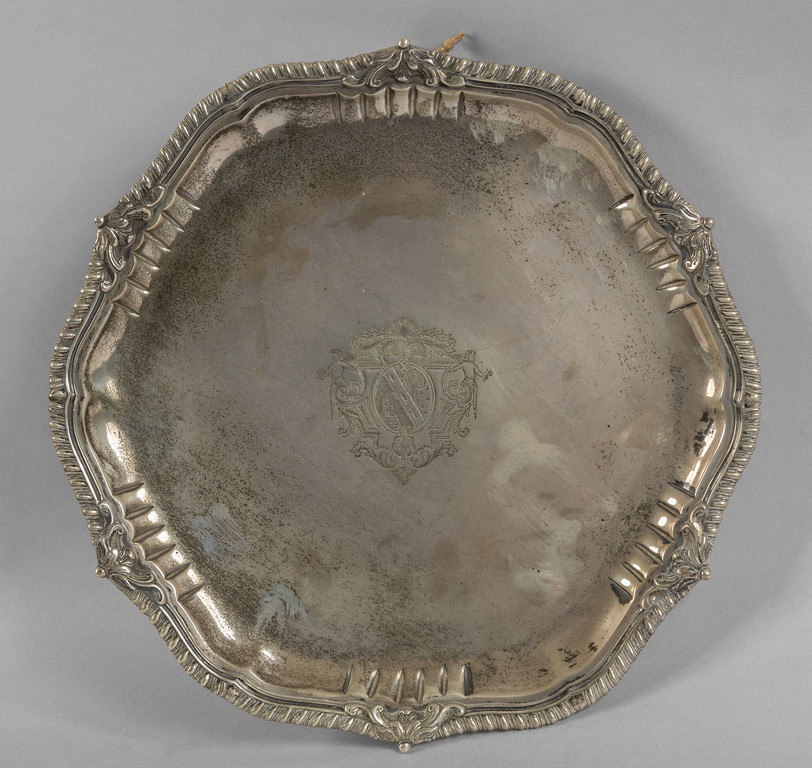 Salver in argento, bordo finemente sbalzato con al centro stemma nobiliare, Inghilterra sec.XIX