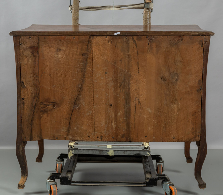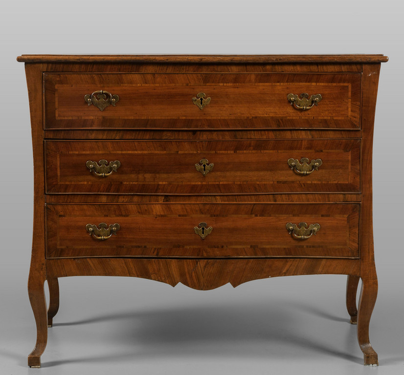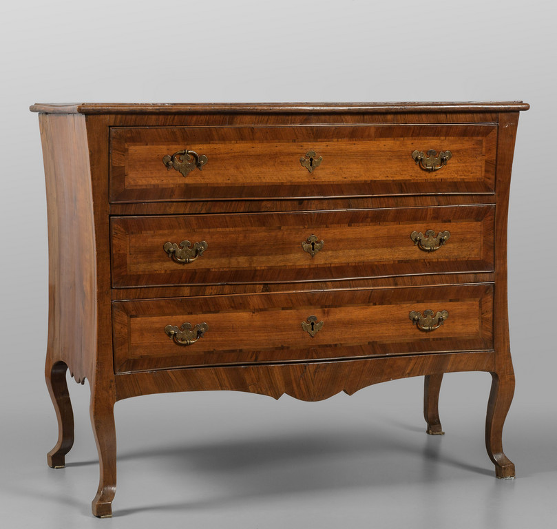 Comò a balestra a tre cassetti sul fronte lastronati, fianchi mossi, Toscana I metà sec.XVIII