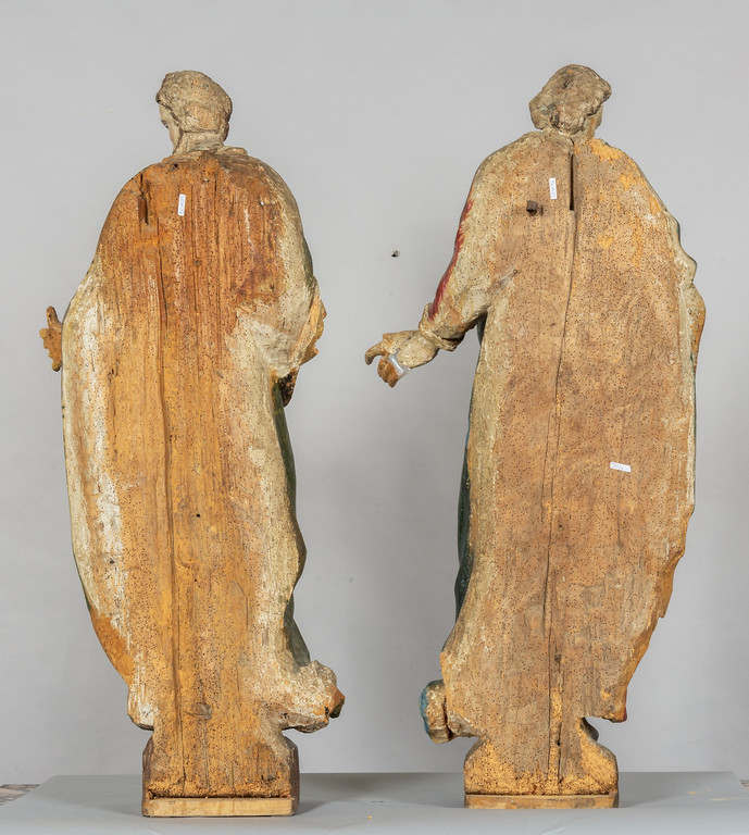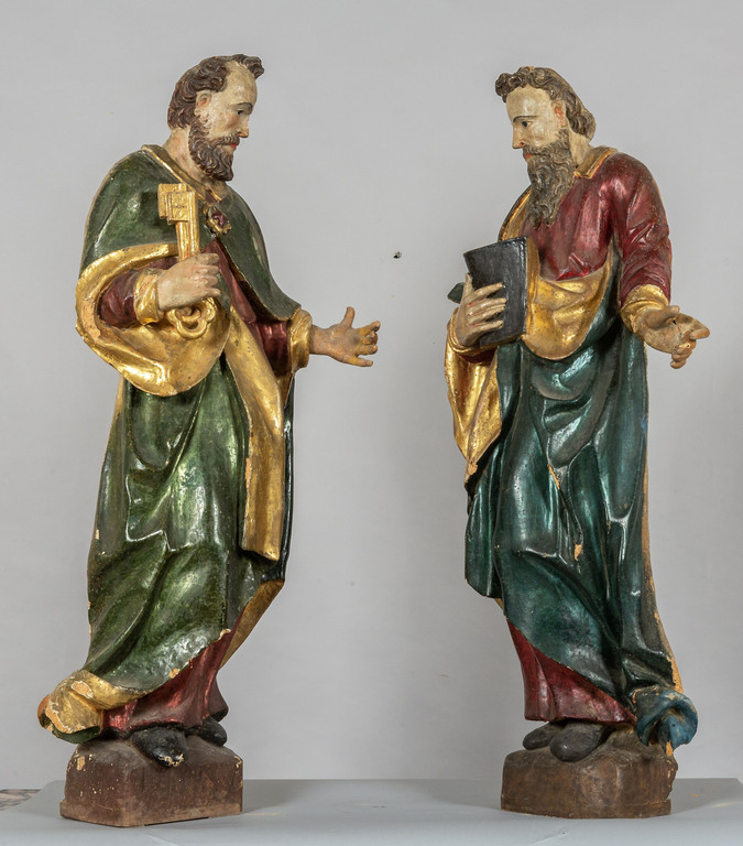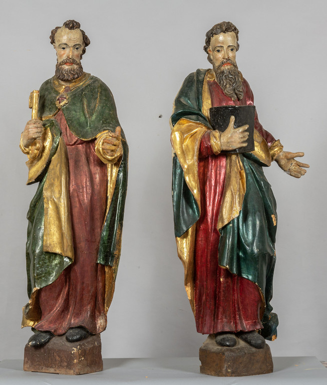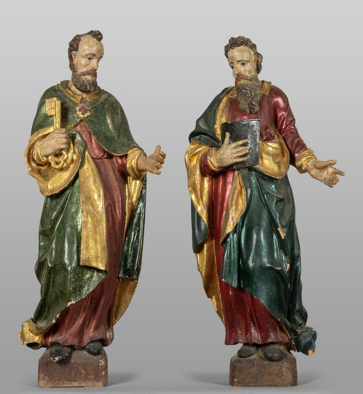 San Pietro e San Paolo, coppia di grandi sculture in legno intagliato, dorato e laccato in policromia, Lombardia sec.XVI