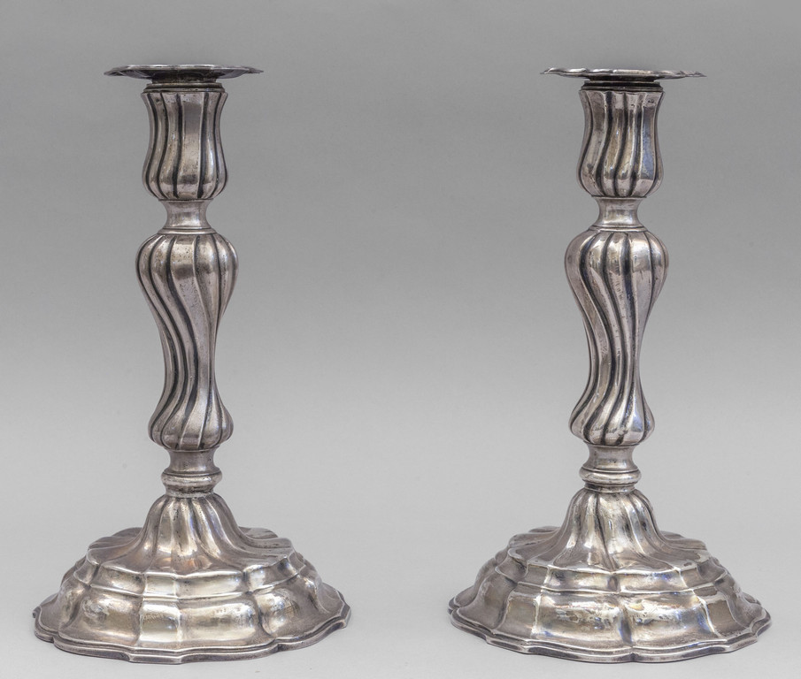 Coppia di candelieri Luigi XV in argento finemente sbalzato a tortiglione, Torino sec.XVIII