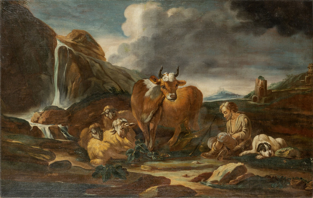 Scuola di Rosa da Tivoli "Paesaggio con armenti e contadino" olio, sec.XVIII