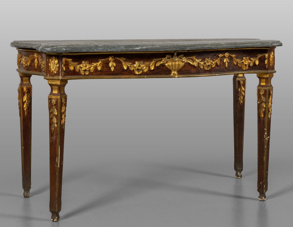 Console Luigi XVI in legno laccato a finto marmo con ricca decorazione ad intaglio a serti di fiori, piano in marmo bardiglio, Toscana II metà sec.XVIII