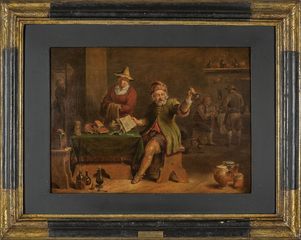 Scuola olandese sec.XVIII "Speziale" olio su tavoletta, cornice antica in legno ebanizzato ed oro
