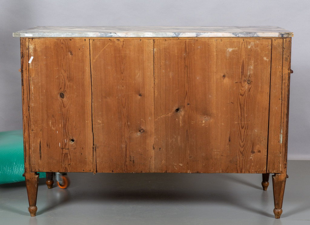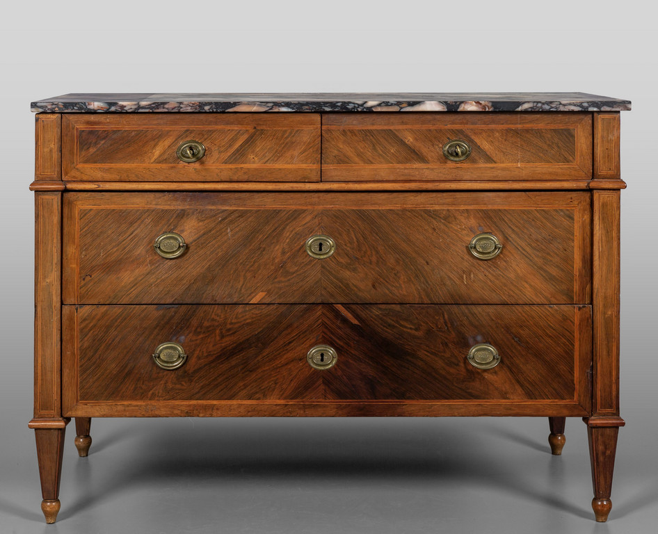 Comò Luigi XVI a due cassetti più due, lastronato in palissandro, piano in marmo fior di pesco, Genova sec.XVIII