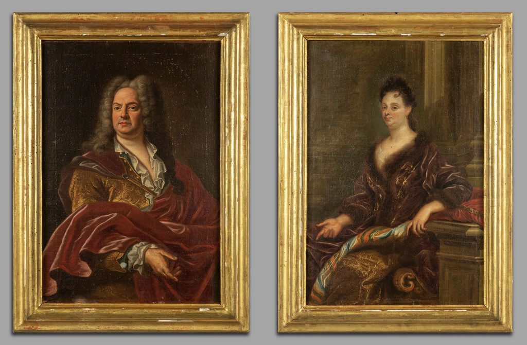 "Ritratti" coppia di olii, cornici coeve in legno dorato a sagoma romana