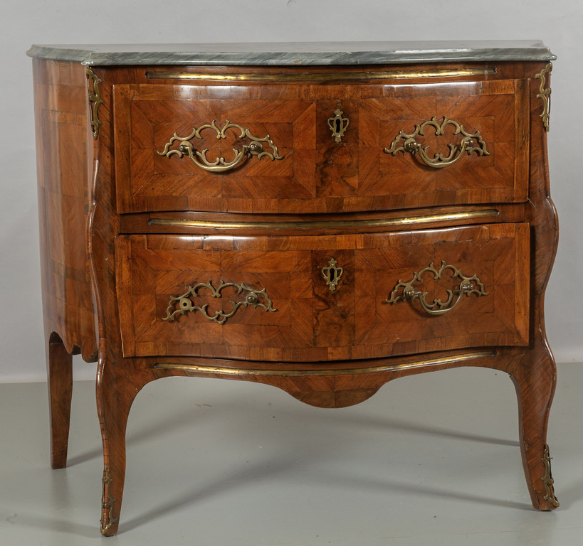 Comò Luigi XIV a due cassetti lastronato e filettato, piano in marmo, Sicilia sec.XVIII