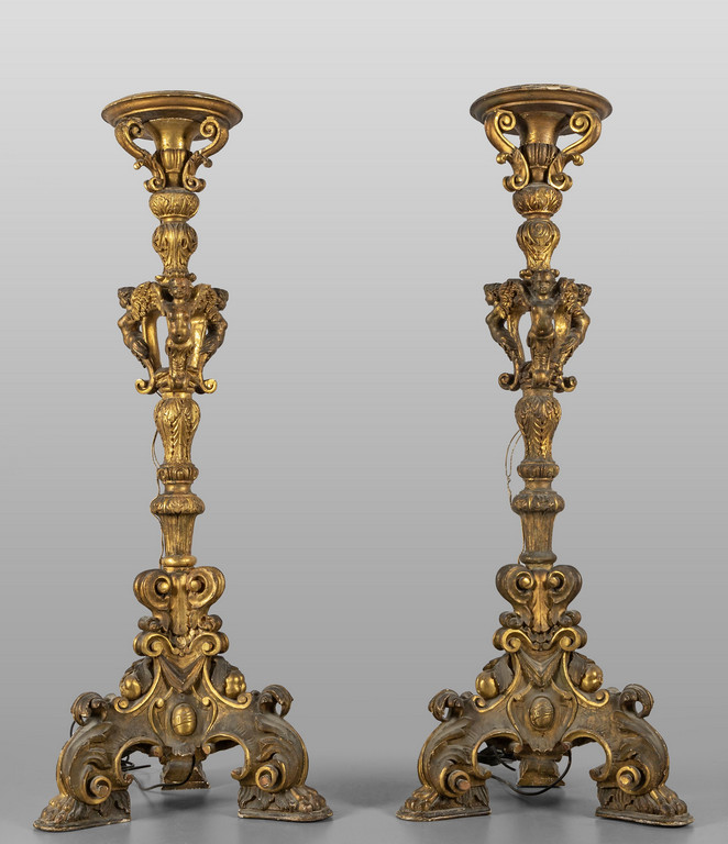 Lotto 0193 | Coppia di torcere in legno intagliato e dorato,