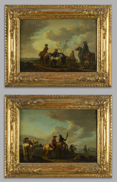 Scuola fiamminga sec.XVIII "Sosta di cavalieri" coppia di olii su tavola
