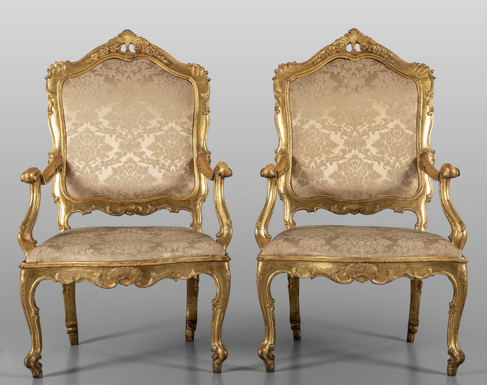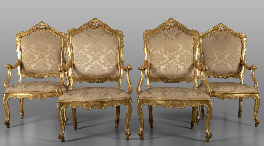 Quattro poltrone Luigi XV in legno finemente intagliato e dorato, Venezia I metà sec.XVIII