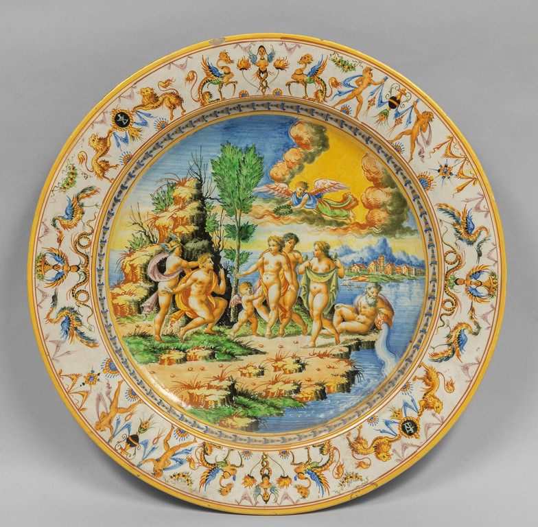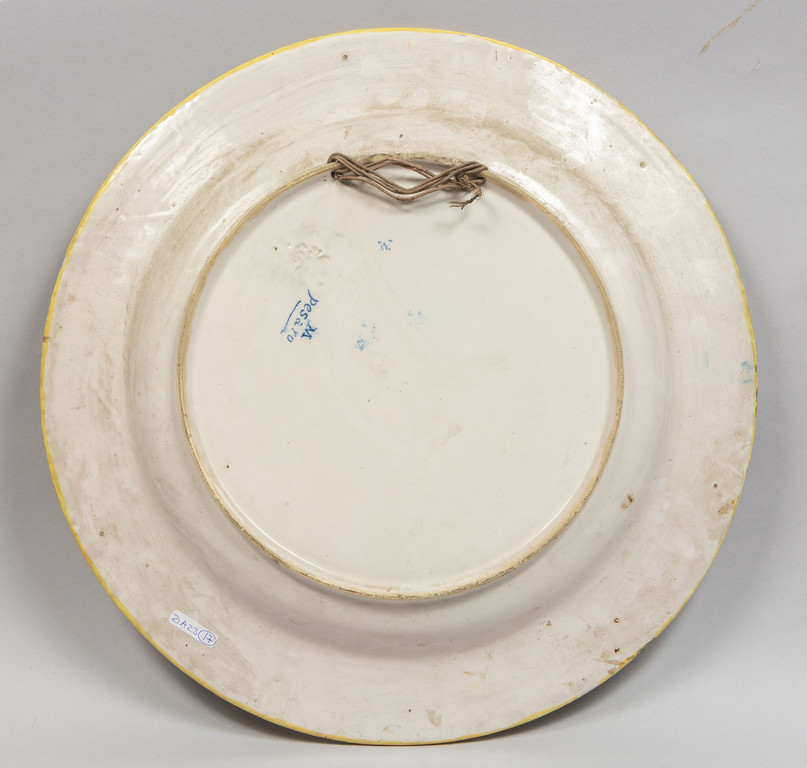 Grande piatto in ceramica policroma decorato in stile antico, f.to nel retro Molaroni Pesaro, sec. XX