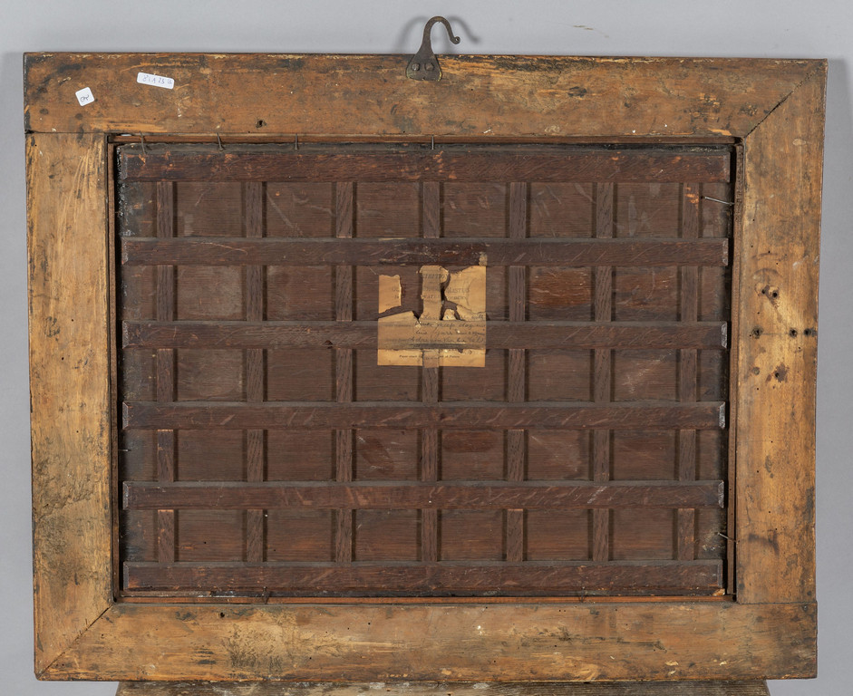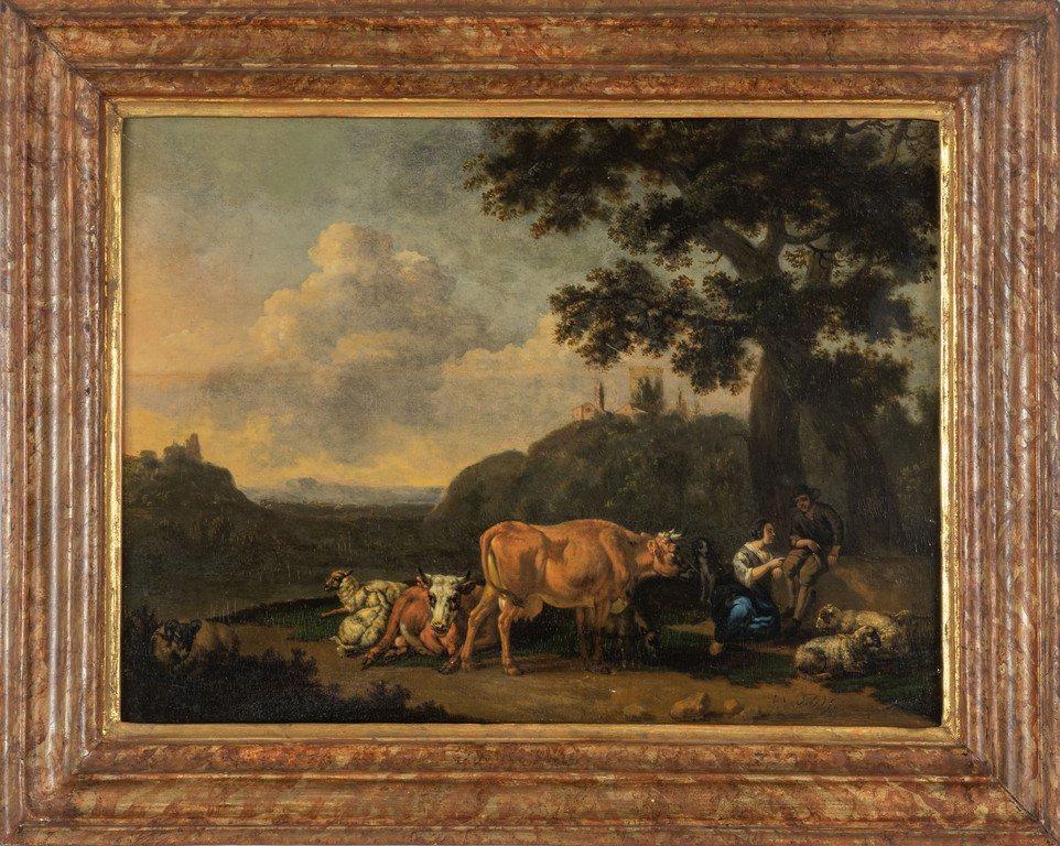 "Paesaggio con armenti" olio su tavola sec.XVIII, cornice coeva in legno marmorizzato