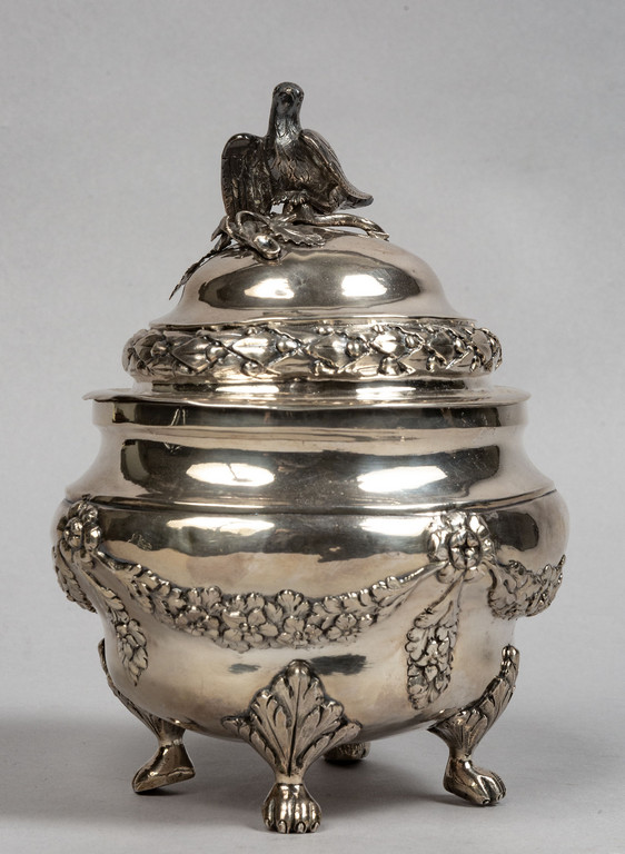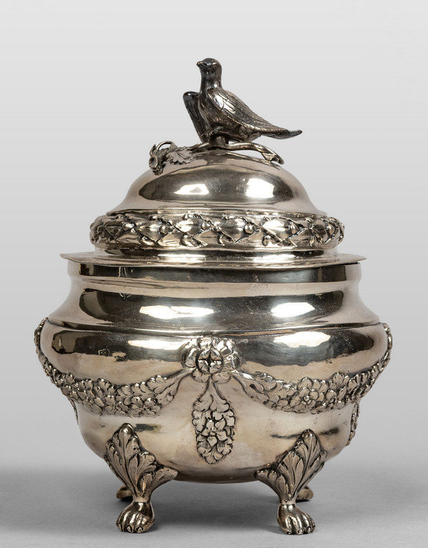 Grande zuccheriera Luigi XVI in argento sbalzato,