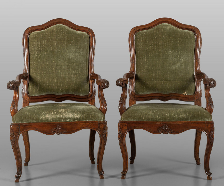 Coppia di poltrone Luigi XIV in noce intagliato, Piemonte I metà sec.XVIII