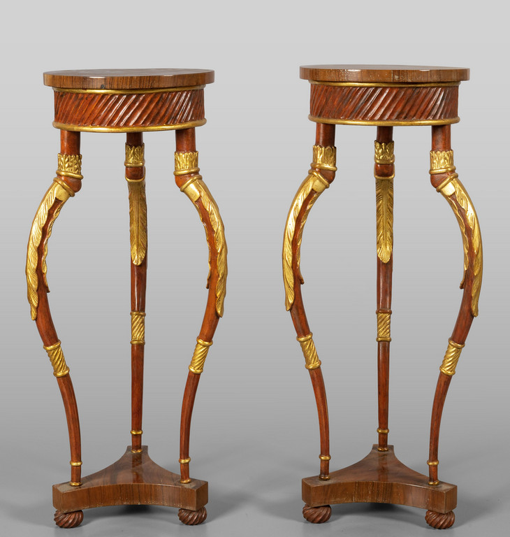 Coppia di gueridons in legno lastronato e laccato rosso e oro, Toscana sec.XIX