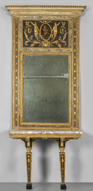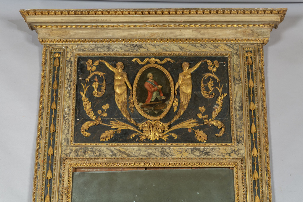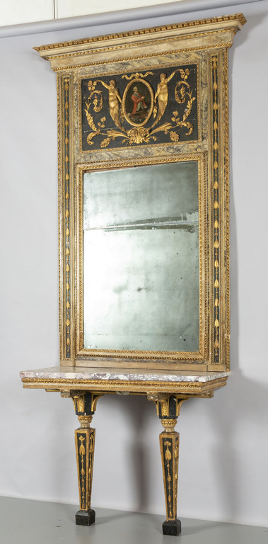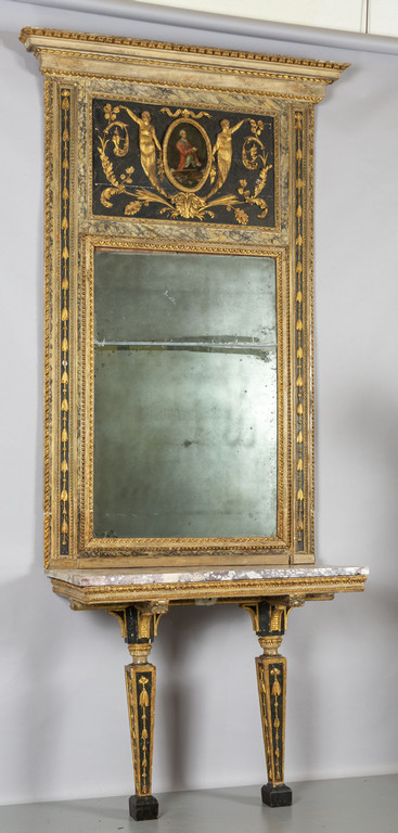 Console con specchiera decorata in policromia ed oro, nella parte superiore ritratto del re Carlo IV di Spagna, piano in marmo viola, Genova fine sec. XVIII
