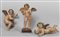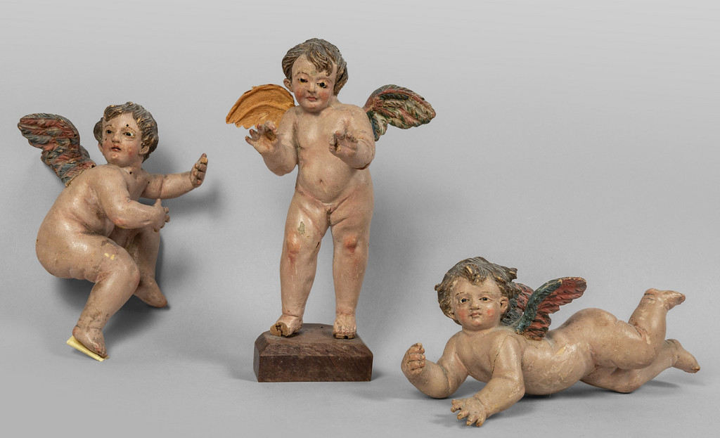 Tre angioletti in legno scolpito e dipinto in policromia, occhi in vetro, sec.XVIII il più alto h. cm.20, piccole mancanze