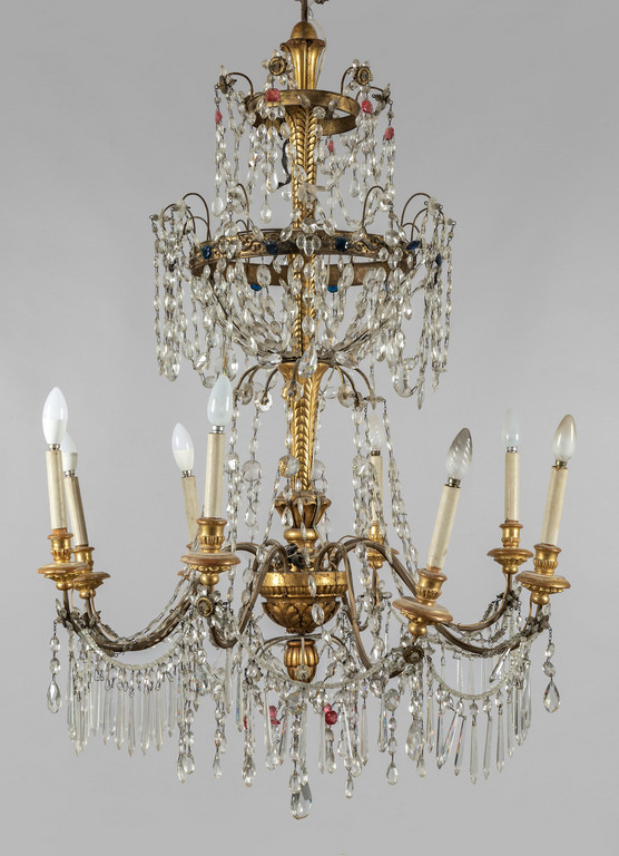 Lampadario Luigi XVI a otto luci, fusto in legno intagliato e dorato, ricca decorazione di cristalli, Genova fine sec.XVIII