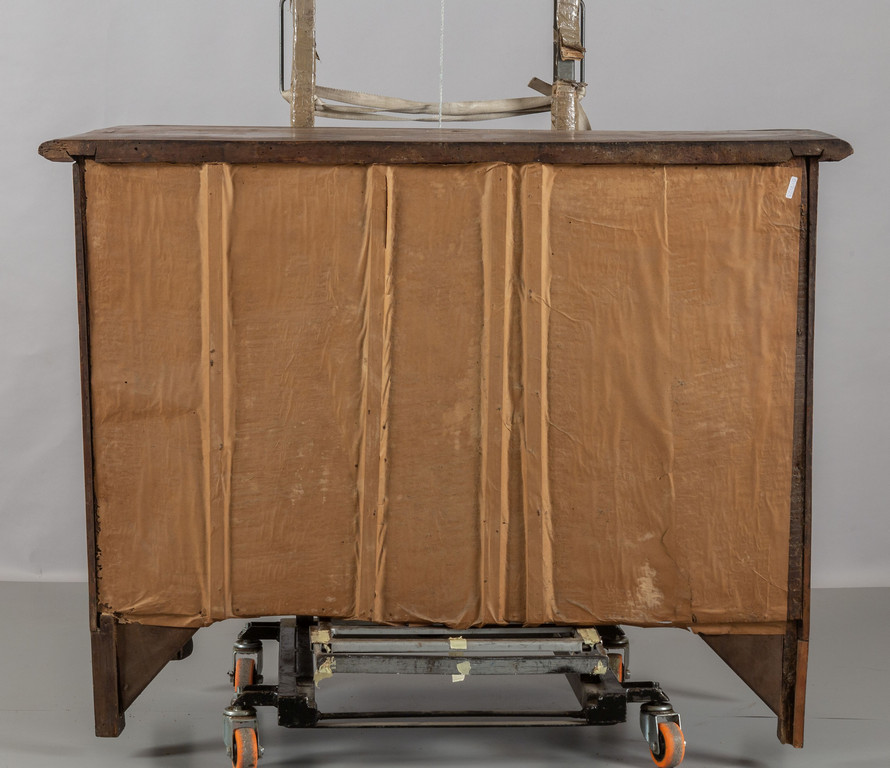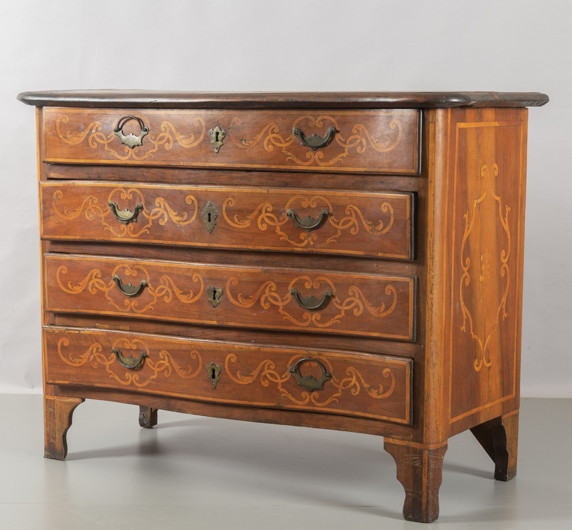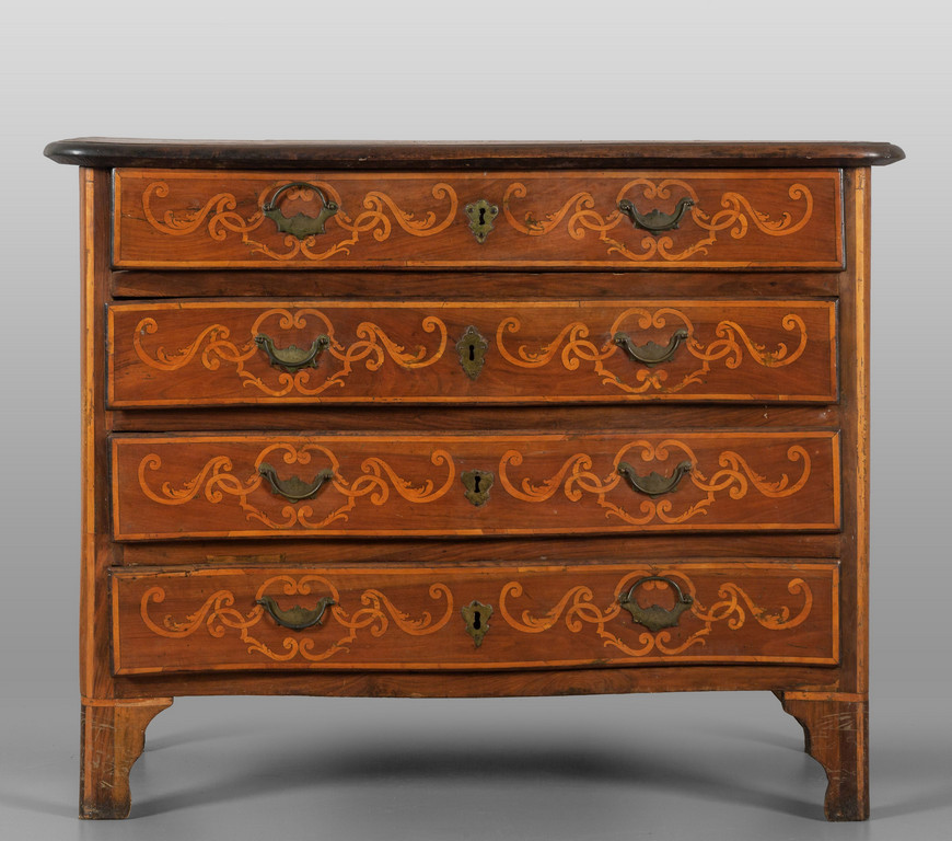 Comò Luigi XIV in massello, filettato con legno di frutto, mosso sul fronte, quattro cassetti, Piemonte sec.XVIII