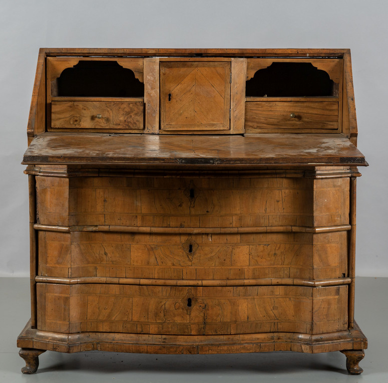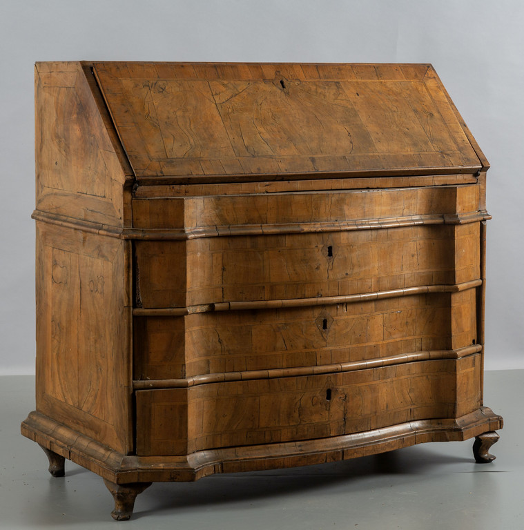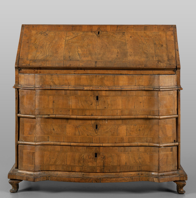 Ribalta Luigi XIV lastronata in noce e radica di noce, Veneto sec.XVIII