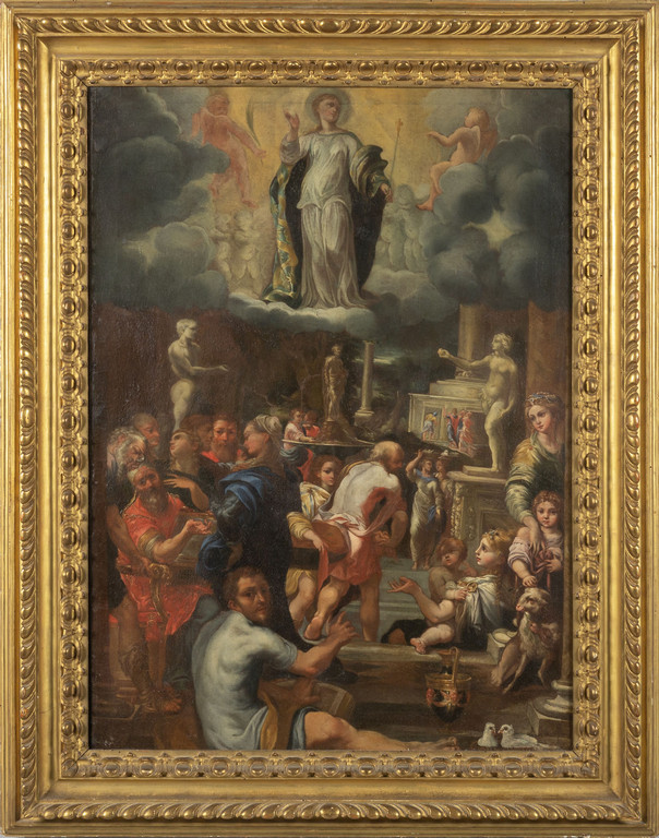 Scuola emiliana sec.XVII "Allegoria dell'Immacolata" olio, cornice in legno dorato