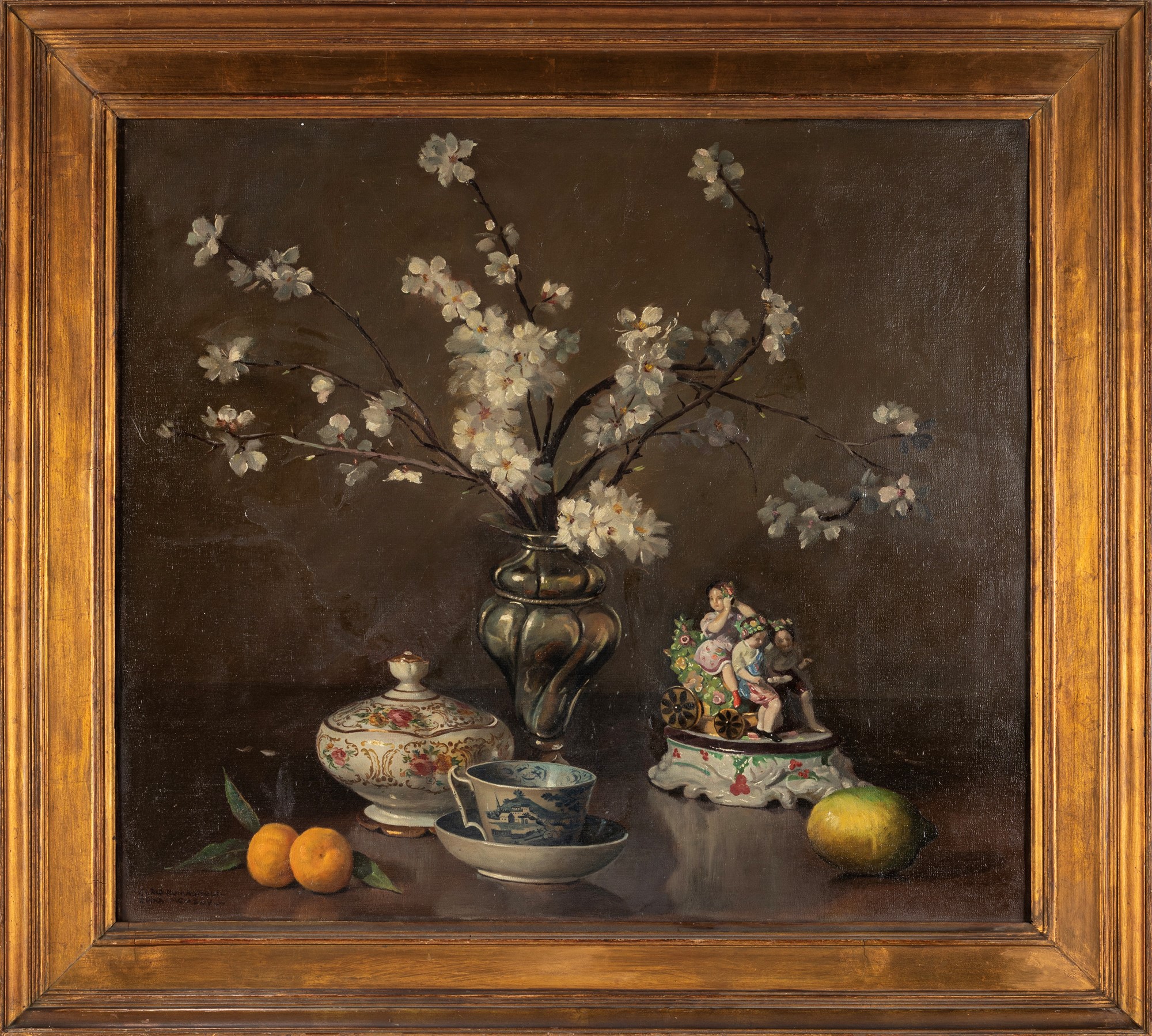 Carlo Romagnoli (Roma 1888-1965) - Natura morta con fiori di ciliegio e porcellane, 1945
