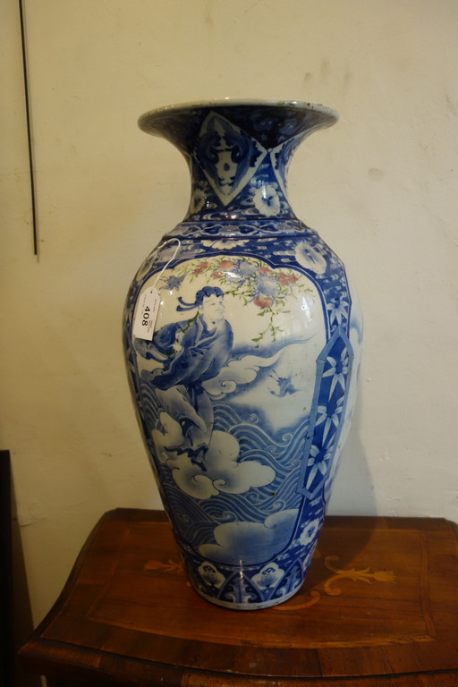 Vaso in porcellana bianca e blu decorato con figura di saggio ed albero di pesche, sec.XX