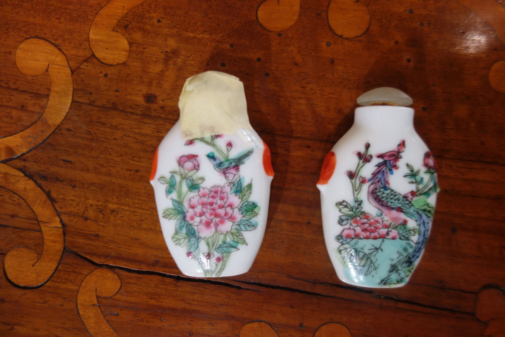 Due snuff bottles in porcellana policroma, famiglia Rosa, Cina sec. XIX
