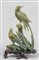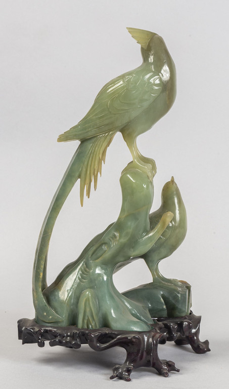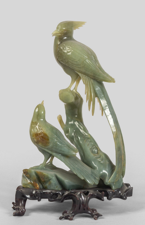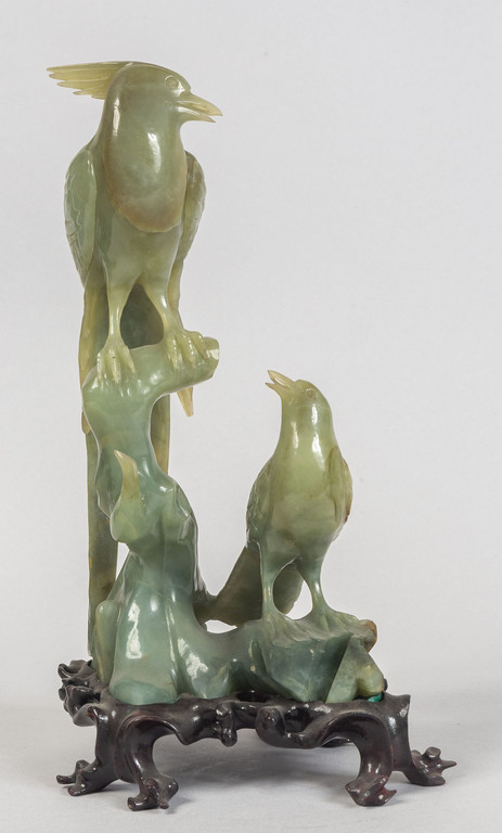 Gruppo in giada verde raffigurante due uccellini su un ramo, base in legno intagliato, Cina sec.XIX