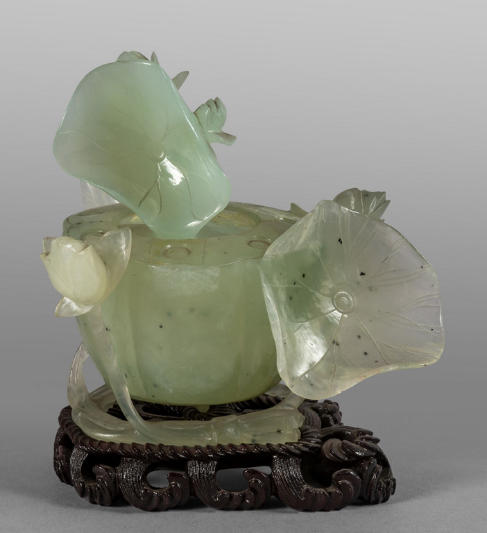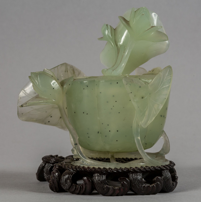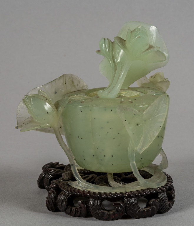 Contenitore a forma di fiore in pietra dura con base in legno, Cina sec.XX
