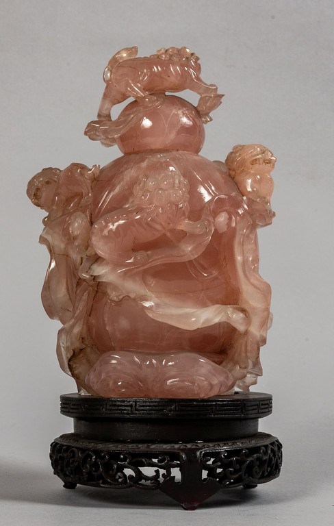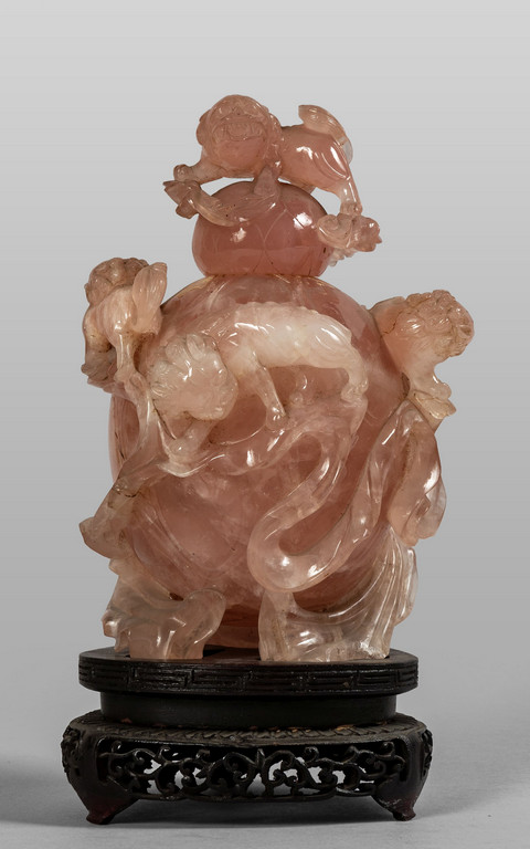 Vaso in quarzo rosa scolpito a motivo di cani di Pho, poggiante su base in legno, Cina sec.XX