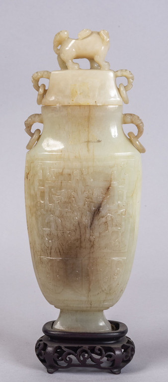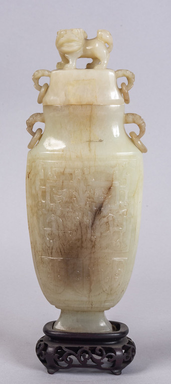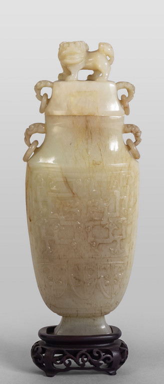 Vaso con coperchio in giada decorato in stile arcaico su base in legno, Cina sec.XIX