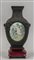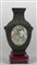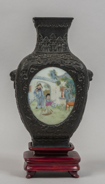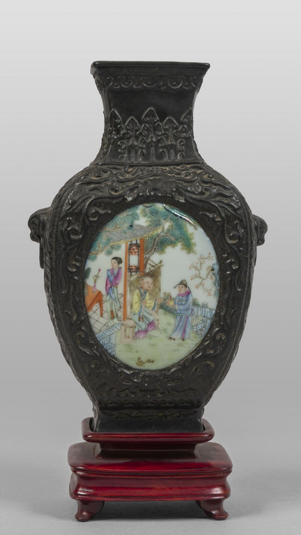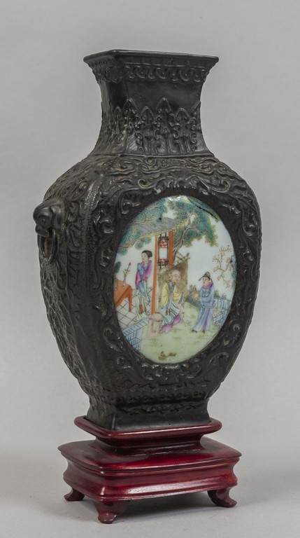 Vaso in porcellana policroma a fondo nero con medaglioni in policromia, marcato alla base, Cina sec.XIX