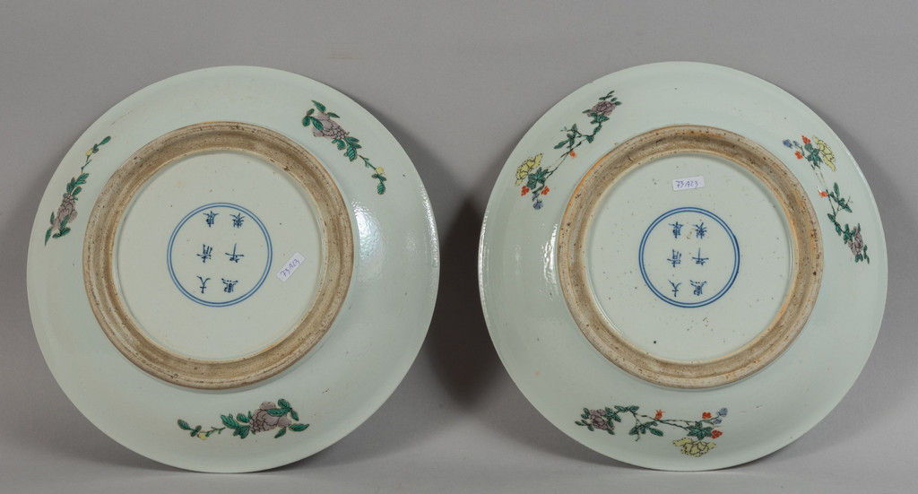 Coppia di piatti in porcellana decorata con personaggi, marcati Kang Xi, dinastia Quing