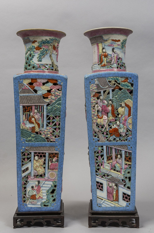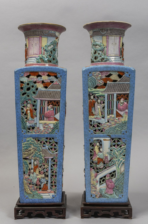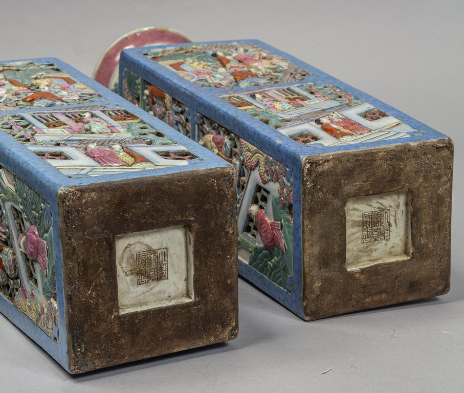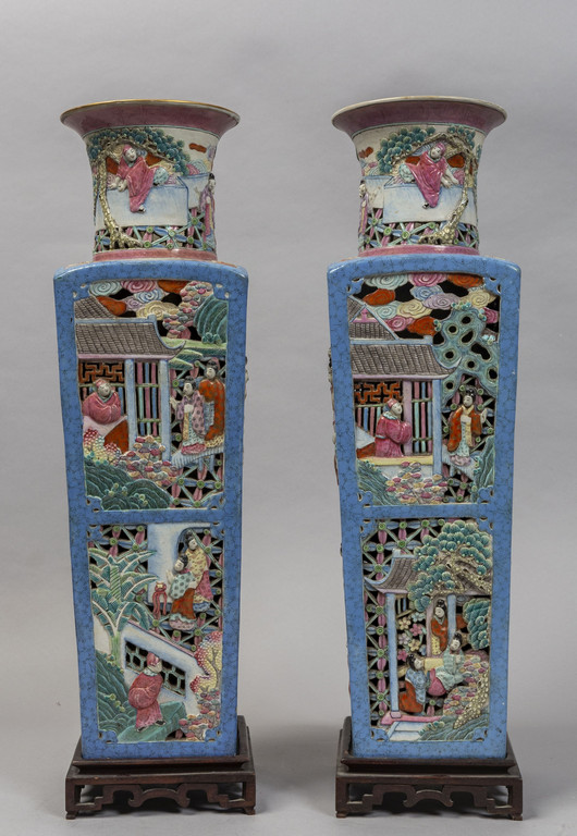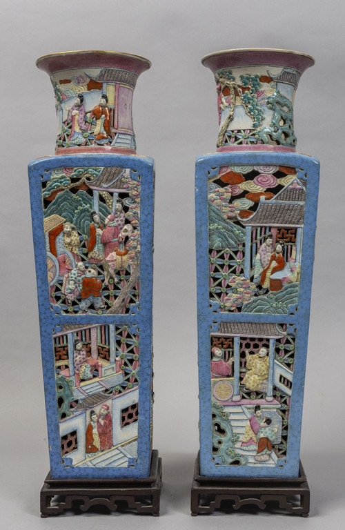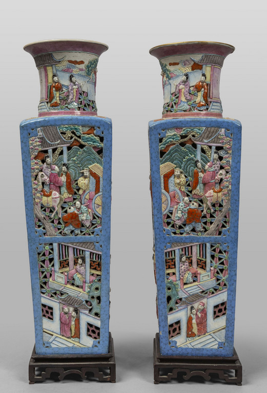 Coppia di vasi in porcellana traforata di forma quadrata, decorati in policromia con scene di vita orientale a rilievo, marcati sul fondo, Cina sec.XIX