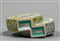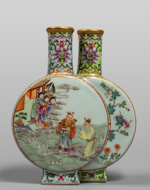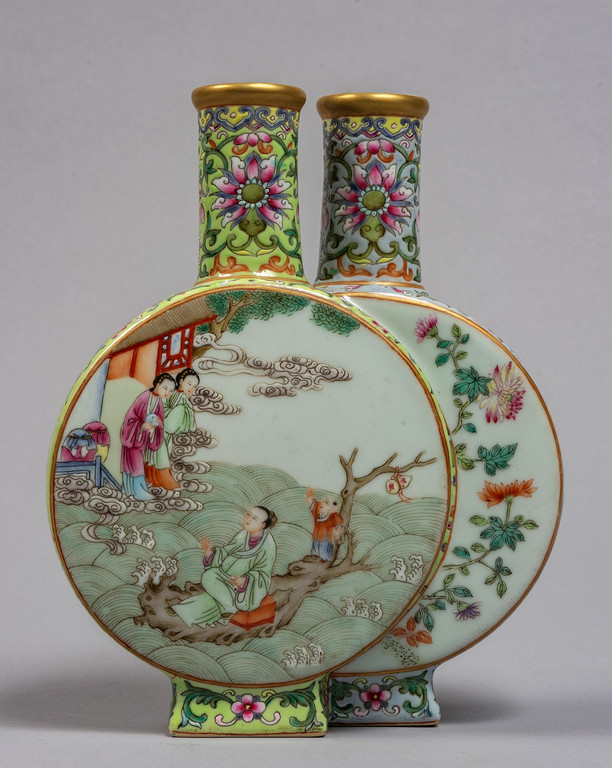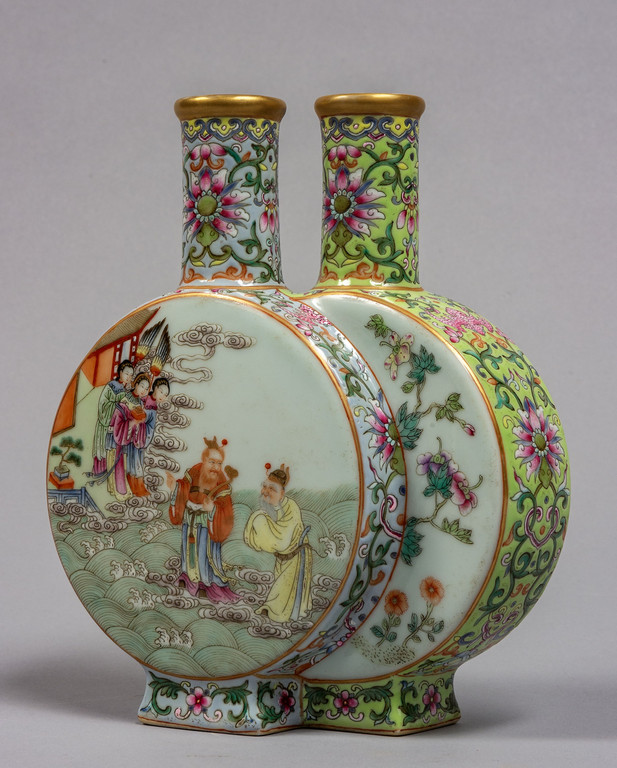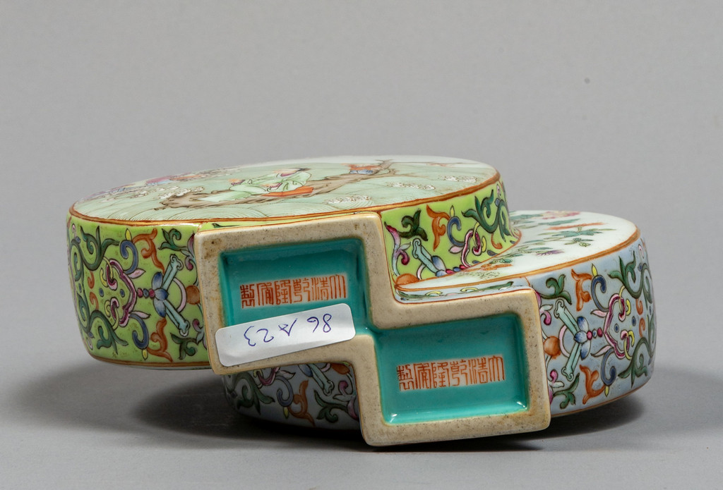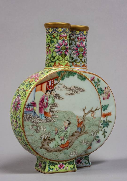 Bivaso in porcellana azzurra e verde decorato in policromia con personaggi, marcato alla base, Cina inizi sec.XX