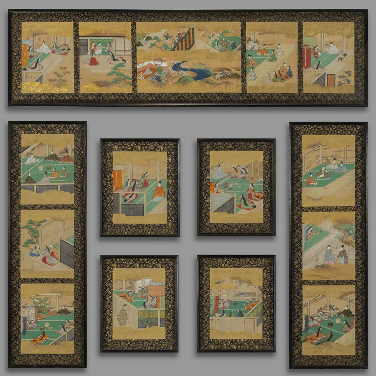 Quindici acquarelli giapponesi raffiguranti scene di vita (cinque in un'unica cornice, tre in due cornici e quattro con cornici singole)