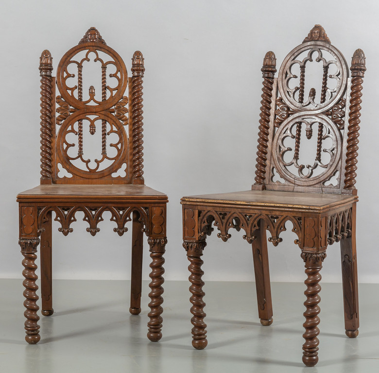 Coppia di sedie neogotiche in legno finemente intagliato, Inghilterra sec.XIX
