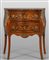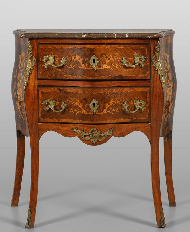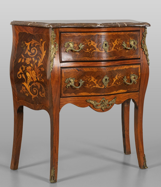 Piccolo comò in stile Luigi XV movimentato sul fronte e sui fianchi, lastronato in palissandro ed intarsiato a motivi floreali, piano in marmo, Francia fine sec.XIX