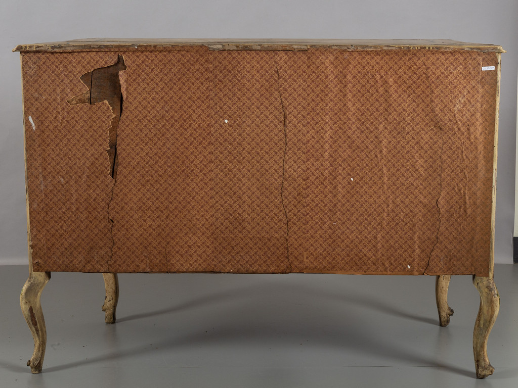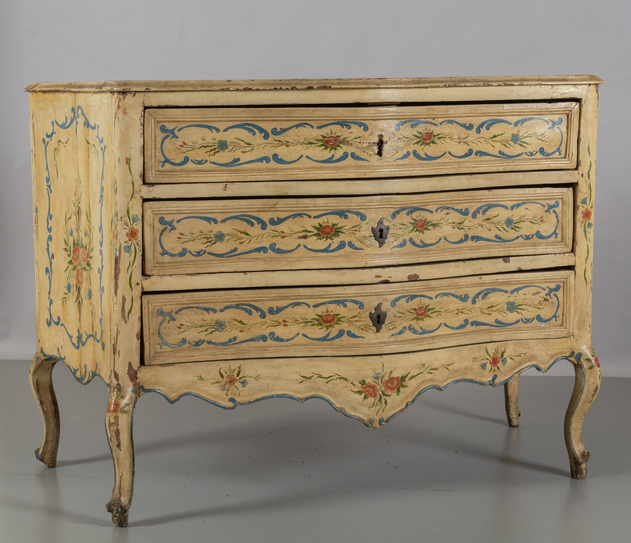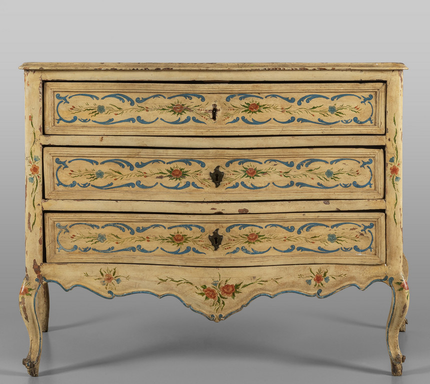 Comò Luigi XIV mosso sul fronte e sui fianchi, tre cassetti, laccato in policromia a fiori su fondo chiaro, sec.XVIII