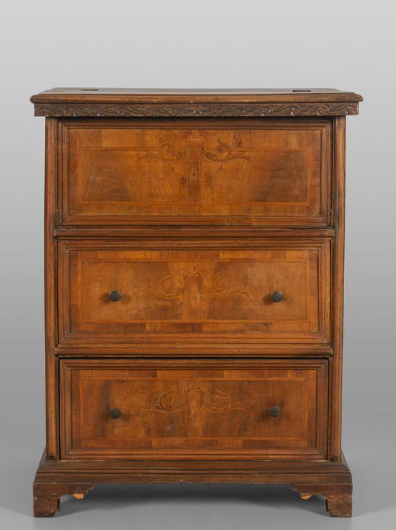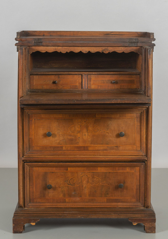 Piccolo comò in noce, tre cassetti sul fronte di cui il superiore ribaltabile a scrittoio, sec.XVIII