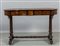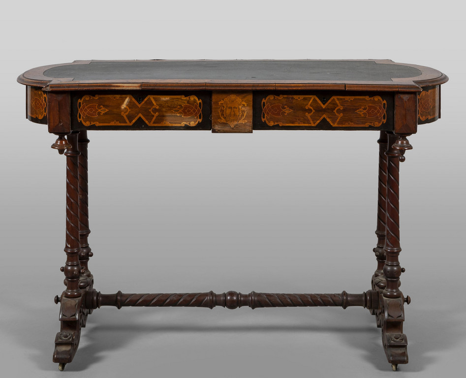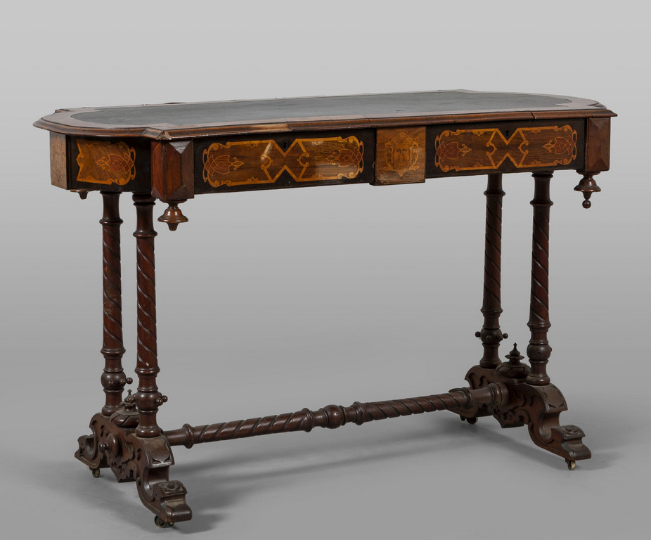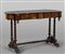 Tavolo scrittoio da centro a due cassetti finemente lastronato ed intarsiato, stampigliato nel cassetto "Robert Strahan Cabinet Maker Dublin" e con cartiglio della manifattura