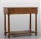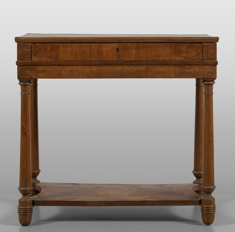 Piccola console neoclassica lastronata in noce, gambe raccordate da pianetto, I metà sec.XIX