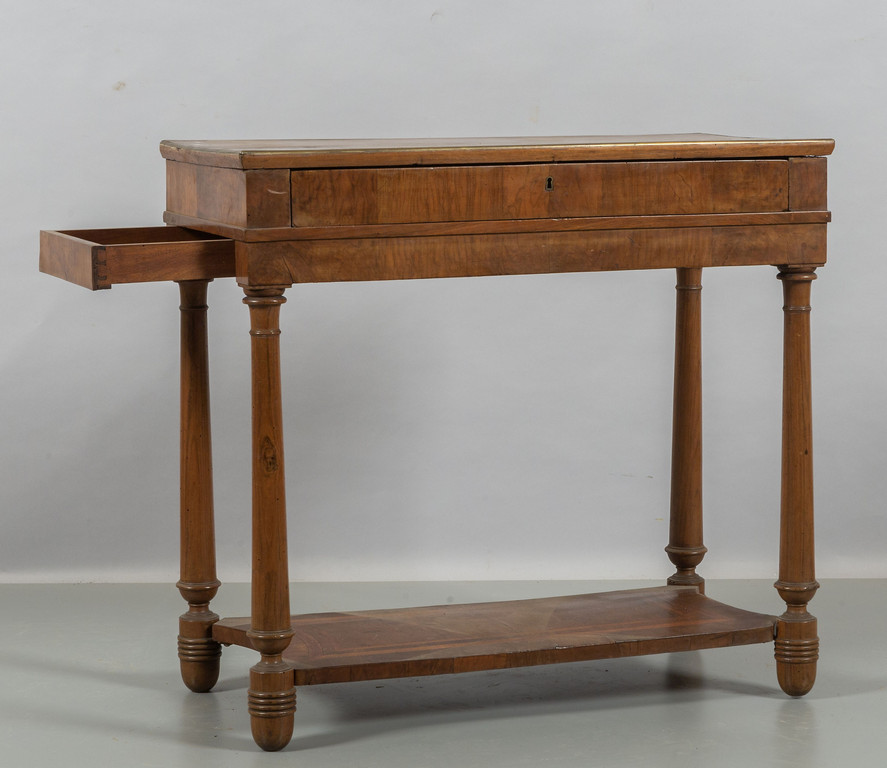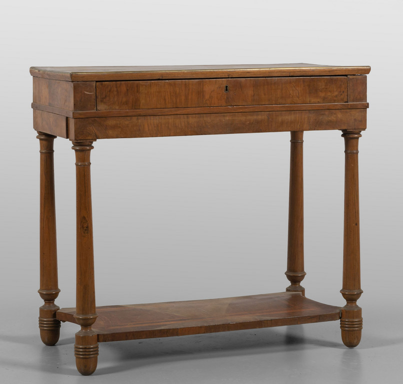 Piccola console neoclassica lastronata in noce,