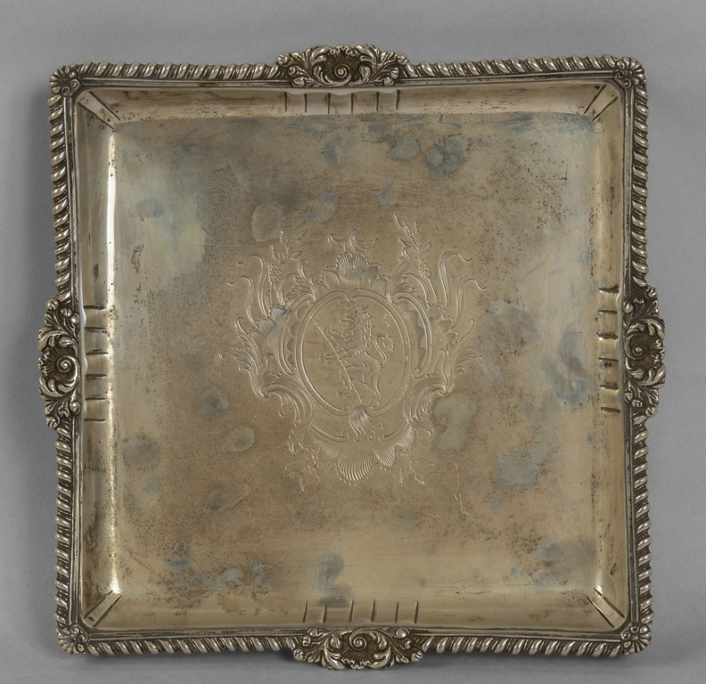 Salver in argento di forma quadrata, bordo finemente sbalzato con al centro inciso stemma nobiliare, Inghilterra sec.XIX