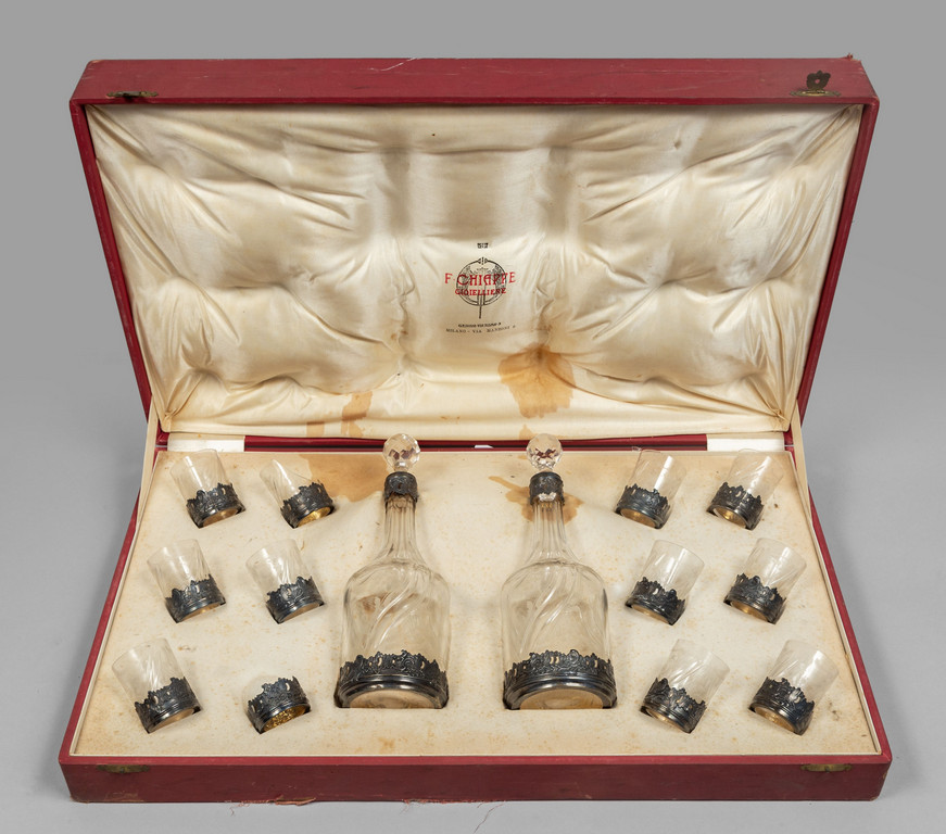 Servizio Liberty da liquore in vetro molato ed argento composto da due bottigliette e 12 bicchierini nella loro scatola originale di F.Chiappe (due bicchieri rotti)