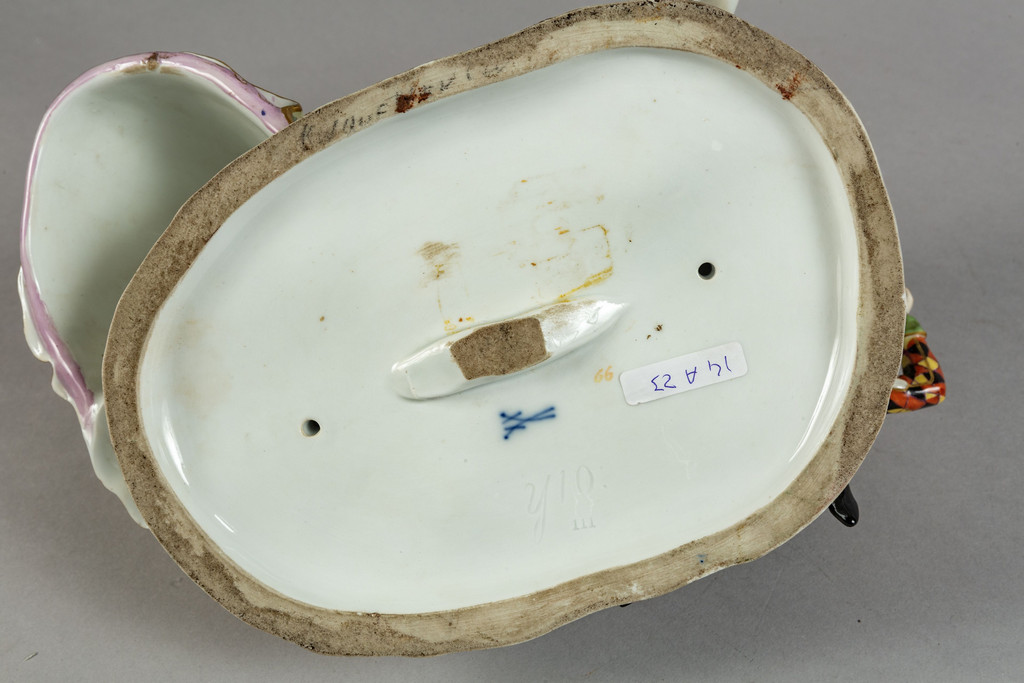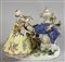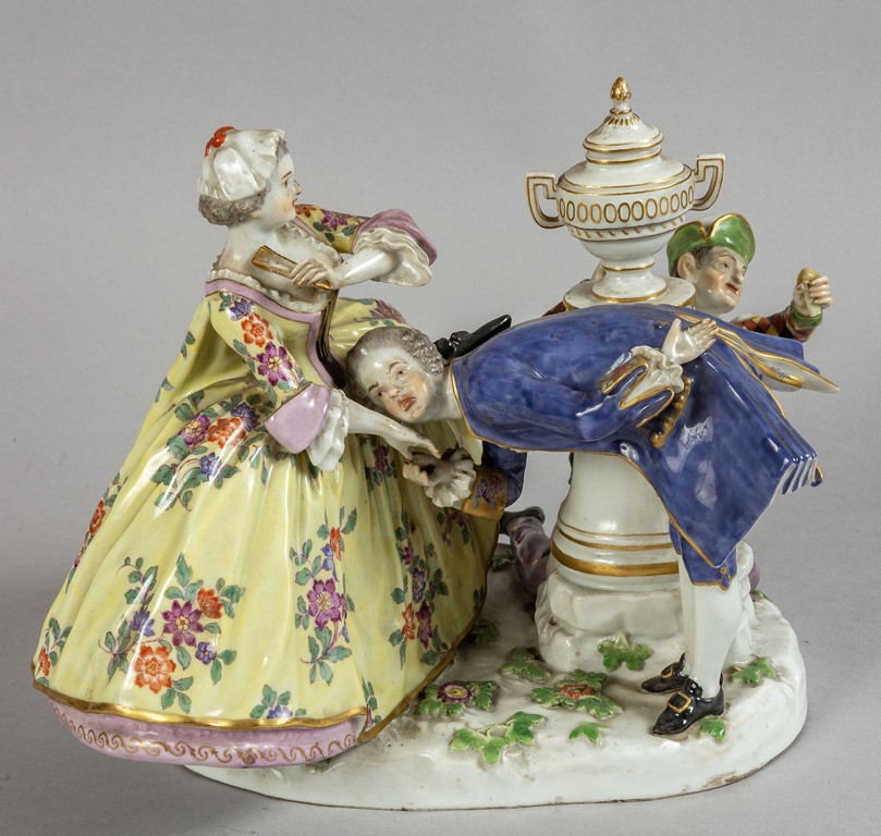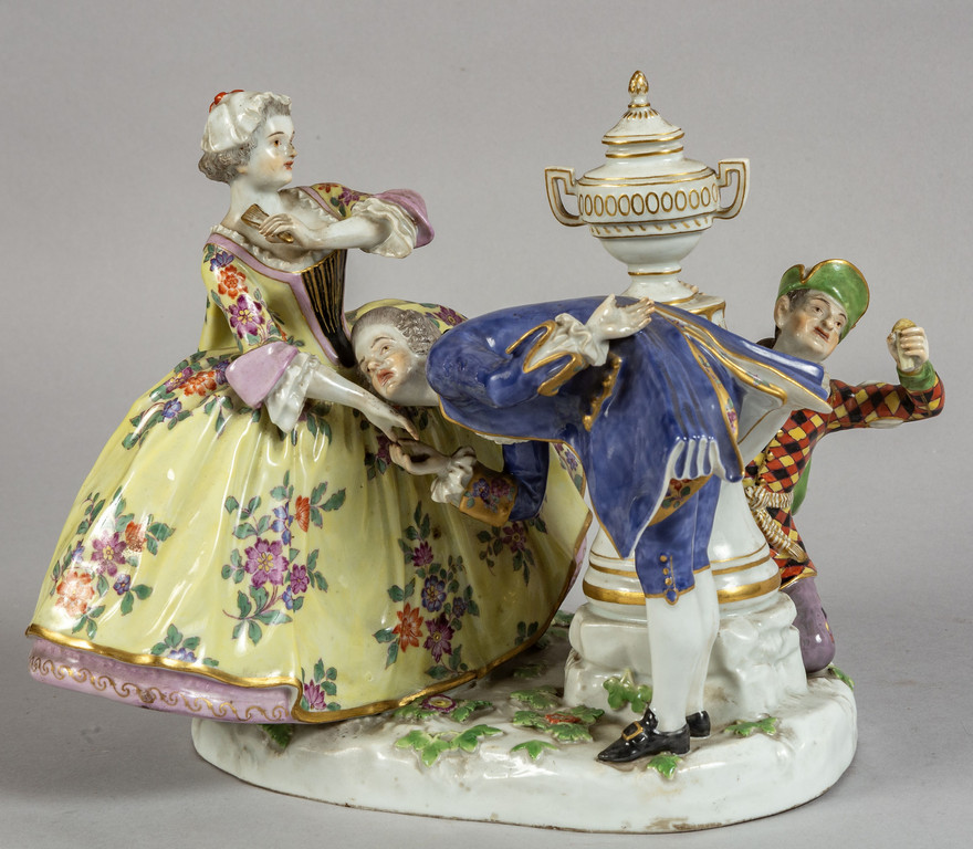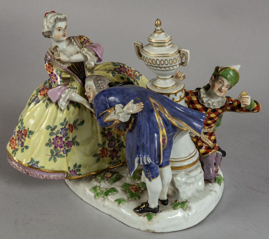 Tre personaggi con arlecchino, gruppo in porcellana di Meissen policroma, Francia sec.XIX