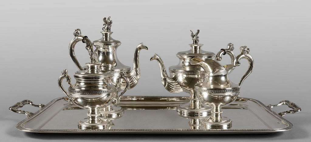 Sevizio da the e caffè in argento in stile Impero, prese con sfingi alate e teste di leoni nei manici