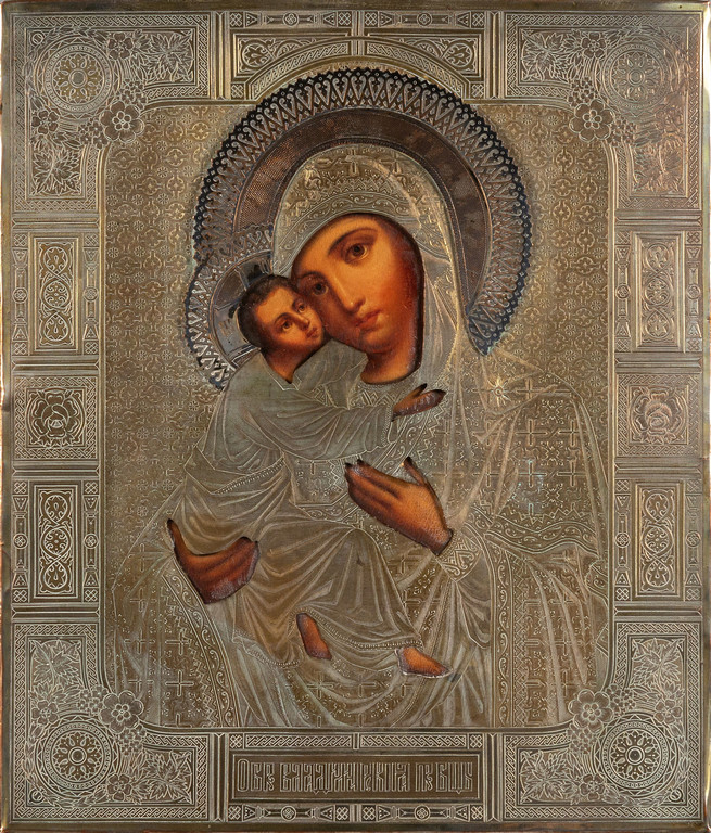 Madonna con Bambino, icona, riza in rame dorato, Russia sec.XIX