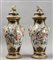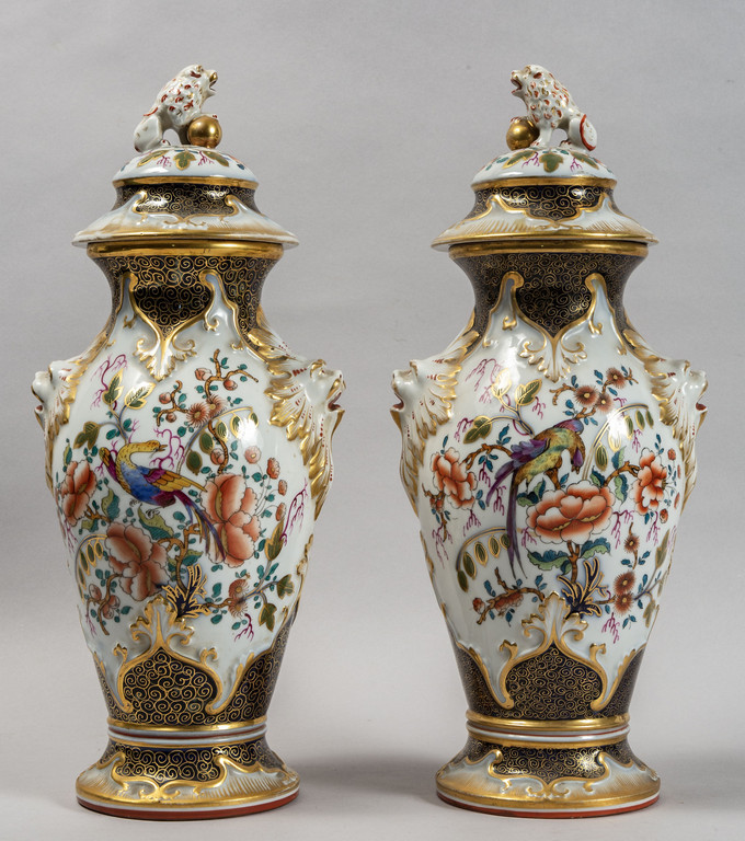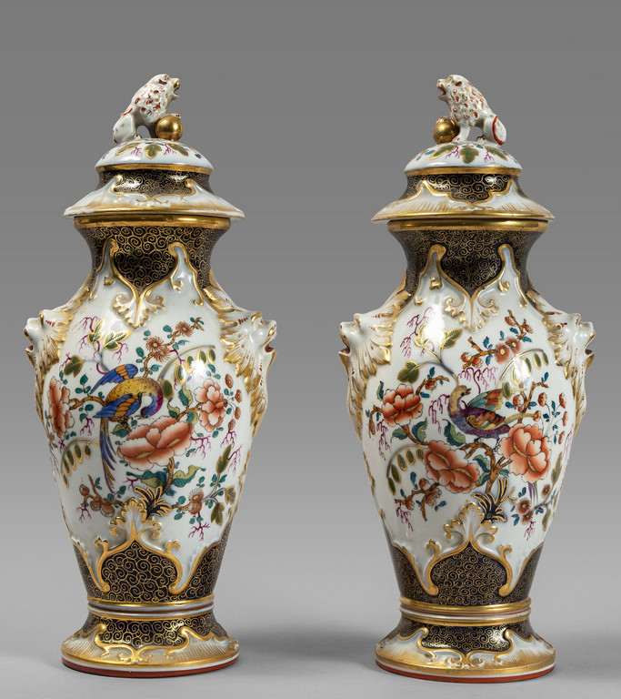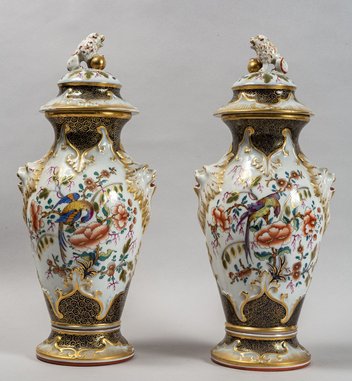 Coppia di vasi Luigi Filippo in porcellana policroma con prese a forma di cani di Pho, Francia sec.XIX